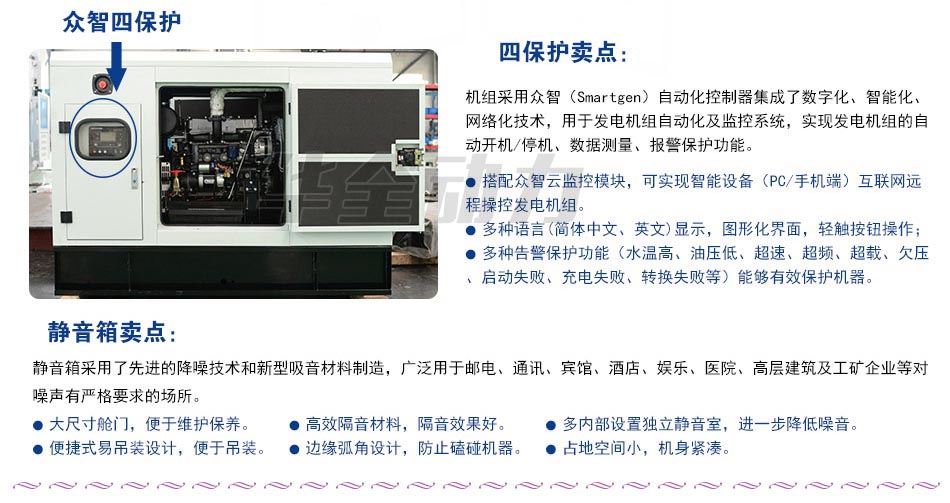 機組采用眾智(Smartgen)自動化控制器集成了數字化、智能化、網絡化技術,用于發電機組自動化及監控系統,實現發電機組的自動開機/停機、數據測量、報警保護功能。
