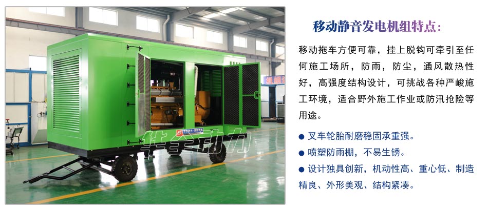 移動靜音發電機組特點: 移動拖車方便可靠,掛上脫鉤可牽引至任何施工場所,防雨,防塵,通風散熱性好,高強度結構設計,可挑戰各種嚴峻施工環境,適合野外施工作業或防汛搶險等用途。