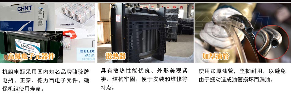 機組電瓶采用國內知名品牌駱駝牌電瓶,正泰、德力西電子元件,確保機組使用壽命。