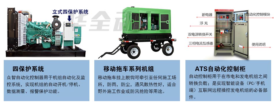 ● 多種告警保護功能(水溫高、油壓低、超速、超頻、超載、欠壓、啟動失敗、充電失敗、轉換失敗等)能夠有效保護機器。 移動拖車系列機組